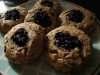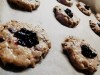Sve sastojke, osim pekmeza, zamesiti u kompaktnu smesu. Zatim rukama napravite srednje male bombice prečnika oko 2cm i poređajte ih u pleh za pečenje u koji ste stavili pek papir. Ostavite dovoljno razmaka između bombica kako bi ste ih mogli pritisnuti jednom čašom ravnog dna da dobiju oblik okruglog keksa debljine oko 5mm. Zatim prstom napravite po sredini svakog keksa udubljenje u koje ćete staviti pekmez. Ja sam koristio pekmez od bobica zove - bazge koji je stvarno fantastičan a vi stavite koji imate.