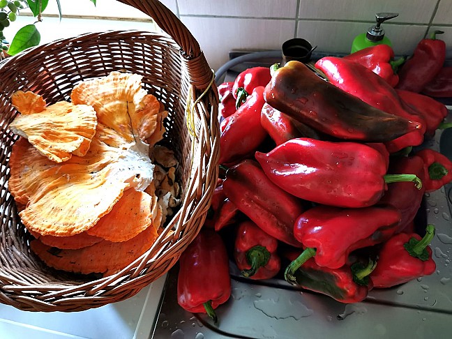 Korpa je puna i mogu kući. Dok sam se vozio natrag prema kući prolazeći kraj malog poljoprivrednog proizvođača, od kojeg inače kupujemo povrće, kada naše smažemo, upadne mi u oko crvena paprika ajvarka i naravno krenu filmovi... Rodi se ideja da napravim ajvar sa gljivama, znači GljivoAjvar, i naravno svratim i kupim papriku.