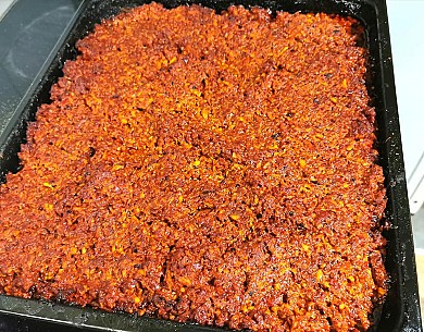 U međuvremenu sam dobro zagrejao 0.5 l ulja koje sam dodao u vruću papriku (dok sipate ulje trebate čuti ono šištanje u dodiru ulja i paprike) i sve dobro promešati i vratiti u rernu da se peče. Ja sam to sve pravio u rerni a može se i na šporetu raditi samo što ćete tada više stajati uz njega kako bi mešali smesu da ne zagori, a ovako na 15 min promešam smesu i vratim je da se prži. Vreme prženja će zavisiti od paprike i količine vode koja treba ispariti, a ono što znam je da ajvar treba dobro upržiti da bi bio dobar i da može dočekati zimu!