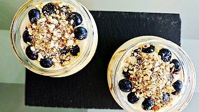 Nakon što ste sipali puding u teglice dodajte malo bobica borovnica ili ribizla