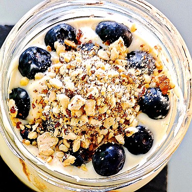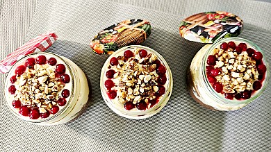 Za kraj, dodati još malo bobičastog voća ribizle i/ili borovnice iz zamrzivača za svežinu i boju i dodajte krupno seckane predhodno malo tostirane - propečene bademe. Prvo stavite bobičasto voće malo ga utisnite u preliv i onda pospite preko njih krupno naseckane bademe ili lešnike ili orahe za hrskavi elemet. Kada ste zadovoljni izgledom teglice sa pudingom ostavite u frižider da se dobro ohladi. Sledi najteži deo a to je čekanje da se puding dobro ohladi.
